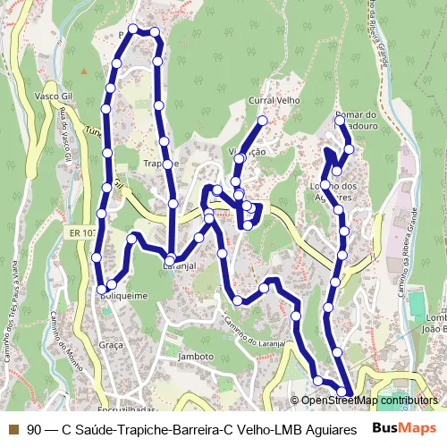 The first stop of the 90 bus route is Casa Saúde (750g) and the last stop is Lombo Aguiares T-90 (631b). 90 (C Saúde-Trapiche-Barreira-C Velho-LMB Aguiares) is operational during everyday.