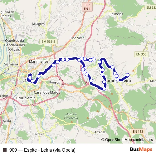 The first stop of the 909 bus route is Espite (Fontanário) and the last stop is Leiria (Terminal). 909 (Espite - Leiria (via Opeia)) is operational during on weekdays.