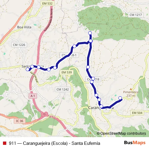 The first stop of the 911 bus route is Caranguejeira (Escola) and the last stop is Santa Eufémia (R. Manuel Simões). 911 (Caranguejeira (Escola) - Santa Eufemia) is operational during on weekdays.