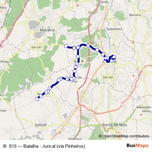 The first stop of the 915 bus route is Batalha (Terminal) and the last stop is Andam (Associação Recreativa). 915 (Batalha - Juncal (via Pinheiros)) is operational during on weekdays.