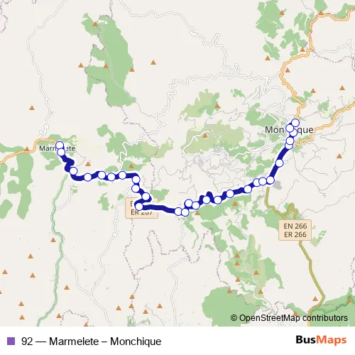 The first stop of the 92 bus route is Marmelete (Casa do Povo) and the last stop is Monchique (Descansa Pernas). 92 (Marmelete – Monchique) is operational during on weekdays.