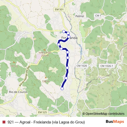 The first stop of the 921 bus route is Ramalheira (Escola) and the last stop is Freixianda (Escolas). 921 (Agroal - Freixianda (via Lagoa do Grou)) is operational during on weekdays.