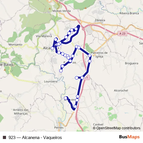 The first stop of the 923 bus route is Alcanena (Terminal) and the last stop is Vaqueiros. 923 (Alcanena - Vaqueiros) is operational during on weekdays.