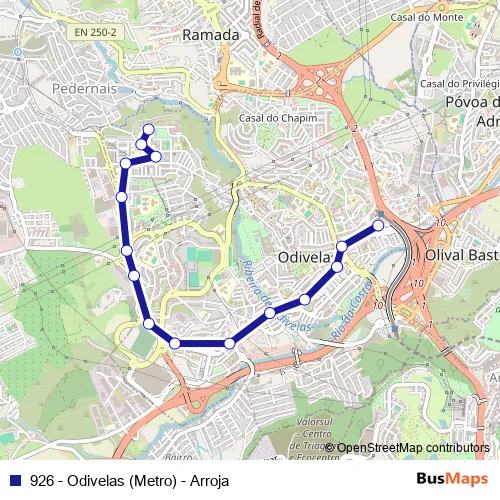 The first stop of the 926 - Odivelas (Metro) - Arroja bus route is Odivelas (Metro) and the last stop is