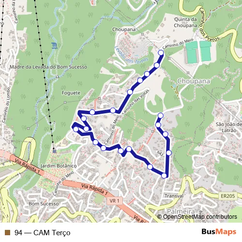 The first stop of the 94 bus route is Choupana T-94 (1128) and the last stop is Caminho do Terço T-94 (1152). 94 (CAM Terço) is operational during on weekdays.