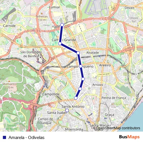 The first stop of the Amarela - Odivelas metro route is Rato and the last stop is Campo Grande. Amarela - Odivelas (Amarela - Odivelas) is operational during on weekdays.