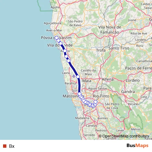 The first stop of the Bx metro route is Estádio do Dragão and the last stop is Póvoa de Varzim. Bx is operational during on weekdays.