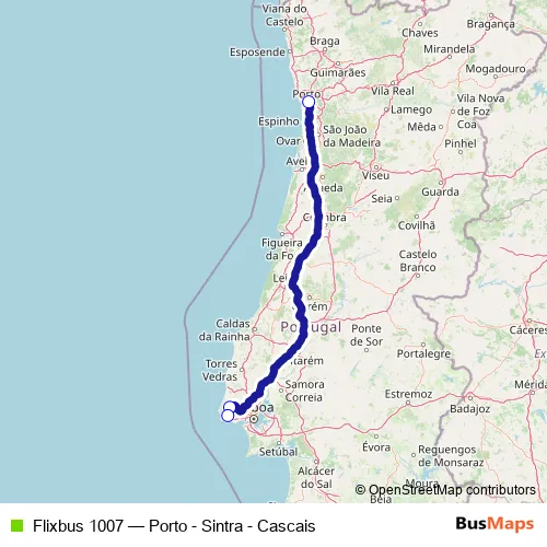 The first stop of the Flixbus 1007 bus route is Porto (TIC - Campanhã) and the last stop is Cascais (Alcabideche). Flixbus 1007 (Porto - Sintra - Cascais) is operational during everyday.