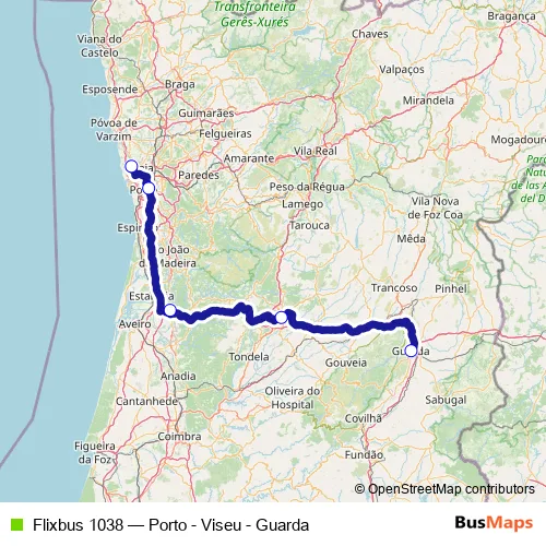 The first stop of the Flixbus 1038 bus route is Porto (Airport) and the last stop is Guarda (Bus Station). Flixbus 1038 (Porto - Viseu - Guarda) is operational during everyday.