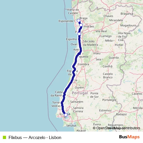 The first stop of the Flixbus bus route is Lisbon (Oriente) and the last stop is Barcelos (Arcozelo). Flixbus (Arcozelo - Lisbon) is operational during everyday.