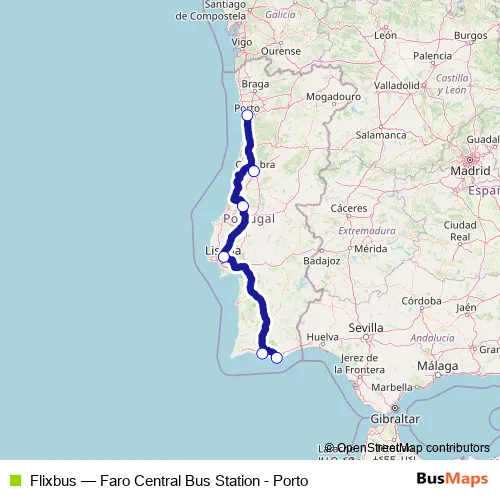 The first stop of the Flixbus bus route is Faro Central Bus Station and the last stop is Porto (TIC - Campanhã). Flixbus (Faro Central Bus Station - Porto) is operational during everyday.