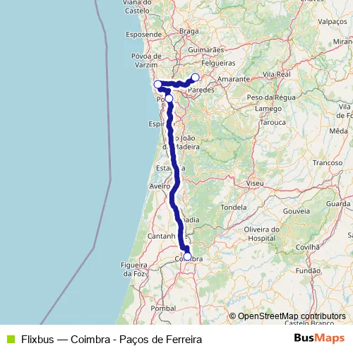 The first stop of the Flixbus bus route is Coimbra R. Padrão and the last stop is Pacos de Ferreira R. D. Frei Carlos. Flixbus (Coimbra - Paços de Ferreira) is operational during everyday.