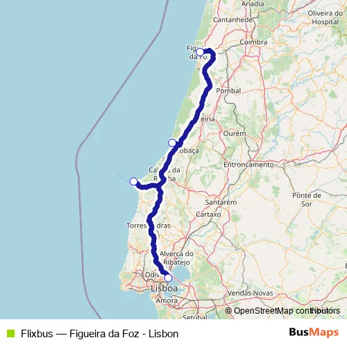 The first stop of the Flixbus bus route is Lisbon (Oriente) and the last stop is Figueira da Foz N109-8. Flixbus (Figueira da Foz - Lisbon) is operational during everyday.