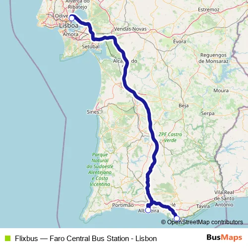 The first stop of the Flixbus bus route is Lisbon (Oriente) and the last stop is Faro Central Bus Station. Flixbus (Faro Central Bus Station - Lisbon) is operational during everyday.
