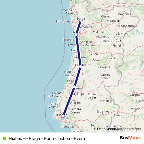 The first stop of the Flixbus bus route is Braga and the last stop is Lisbon, Lisbon (Oriente). Flixbus (Braga - Porto - Lisbon - Évora) is operational during everyday.
