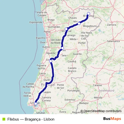 The first stop of the Flixbus bus route is Lisbon (Oriente) and the last stop is Braganca Bus Station. Flixbus (Bragança - Lisbon) is operational during everyday.