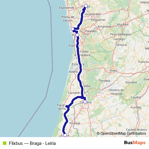The first stop of the Flixbus bus route is Leiria Bus Station and the last stop is Braga Bus Station. Flixbus (Braga - Leiria) is operational during everyday.