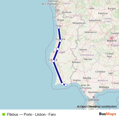 The first stop of the Flixbus bus route is Porto, Porto (Camélias) and the last stop is Faro, Faro (Av. Republica). Flixbus (Porto - Lisbon - Faro) is operational during everyday.
