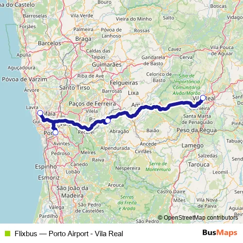 The first stop of the Flixbus bus route is Vila Real Bus Terminal and the last stop is Porto Airport. Flixbus (Porto Airport - Vila Real) is operational during everyday.