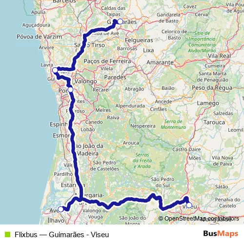 The first stop of the Flixbus bus route is Guimaraes Bus Station and the last stop is Viseu Av. Dr. Antonio Jose de Almeida. Flixbus (Guimarães - Viseu) is operational during everyday.