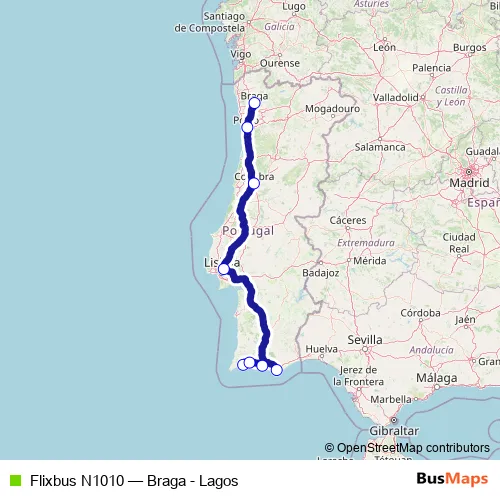 The first stop of the Flixbus N1010 bus route is Lagos and the last stop is Braga (Centro de Transportes). Flixbus N1010 (Braga - Lagos) is operational during everyday.