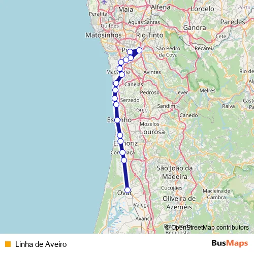 The first stop of the Linha de Aveiro rail route is Porto Campanha and the last stop is Ovar. Linha de Aveiro (Linha de Aveiro) is operational during everyday.