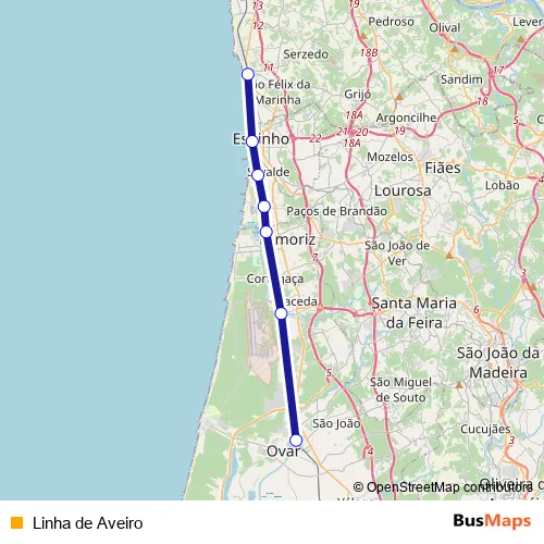 The first stop of the Linha de Aveiro rail route is Granja and the last stop is Ovar. Linha de Aveiro (Linha de Aveiro) is operational during everyday.