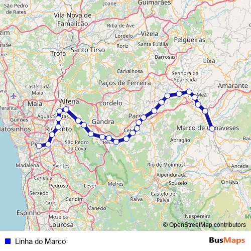 Additional information: Linha do Marco has 27 stops and the total trip duration for this route is approximately 83 minutes.