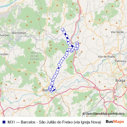 The first stop of the M31 bus route is Barcelos (Central) - Cais 22 and the last stop is S.Julião de Freixo. M31 (Barcelos - São Julião do Freixo (via Igreja Nova)) is operational during everyday.