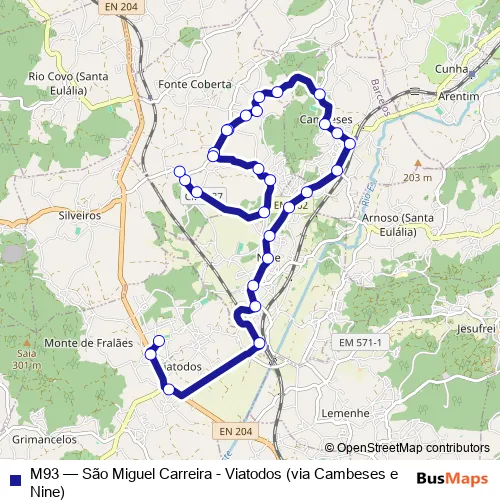 The first stop of the M93 bus route is Viatodos (Escola EB 23) and the last stop is São Miguel Carreira (Parolo). M93 (São Miguel Carreira - Viatodos (via Cambeses e Nine)) is operational during on weekdays.