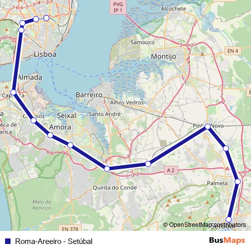 Additional information: Roma-Areeiro - Setúbal has 14 stops and the total trip duration for this route is approximately 59 minutes.