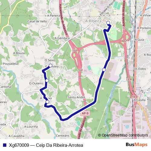 The first stop of the Xg670009 bus route is Arrotea and the last stop is Ceip da Ribeira. Xg670009 (Ceip Da Ribeira-Arrotea) is operational during on weekdays.