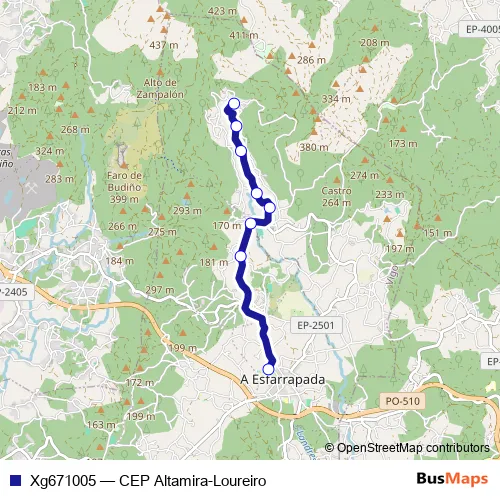 The first stop of the Xg671005 bus route is Loureiro and the last stop is CEP Altamira. Xg671005 (CEP Altamira-Loureiro) is operational during on weekdays.