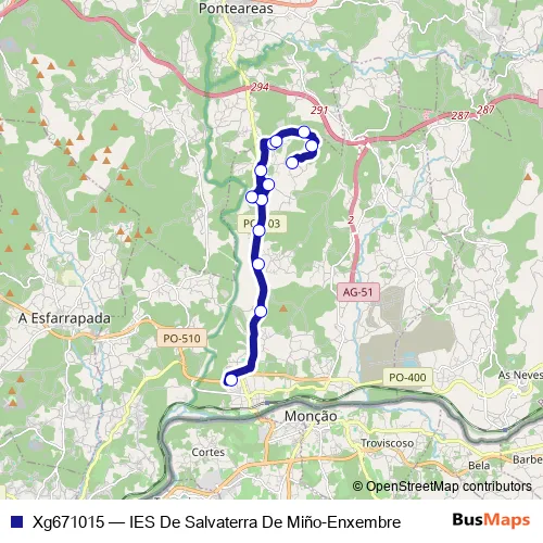 The first stop of the Xg671015 bus route is IES De Salvaterra De Miño and the last stop is Enxembre. Xg671015 (IES De Salvaterra De Miño-Enxembre) is operational during on weekdays.
