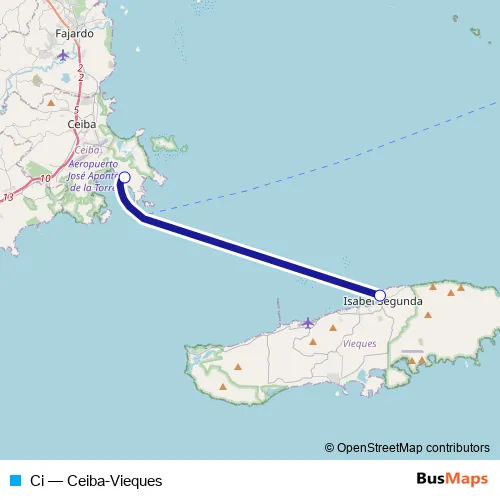 The first stop of the Ci ferry route is Terminal de Lanchas Vieques (Isabel Ii) and the last stop is Terminal de Lanchas de Ceiba. Ci (Ceiba-Vieques) is operational during everyday.