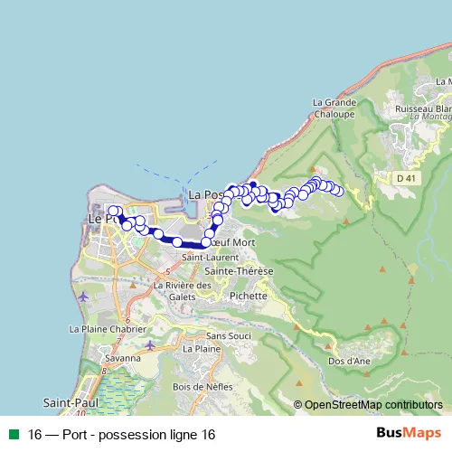 The first stop of the 16 bus route is Ravine à Malheur and the last stop is La Glacière. 16 (Port - possession ligne 16) is operational during everyday.