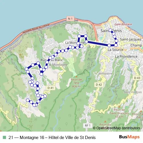 The first stop of the 21 bus route is Hôtel de Ville de St Denis and the last stop is Montagne 16ème. 21 (Montagne 16 – Hôtel de Ville de St Denis) is operational during everyday.