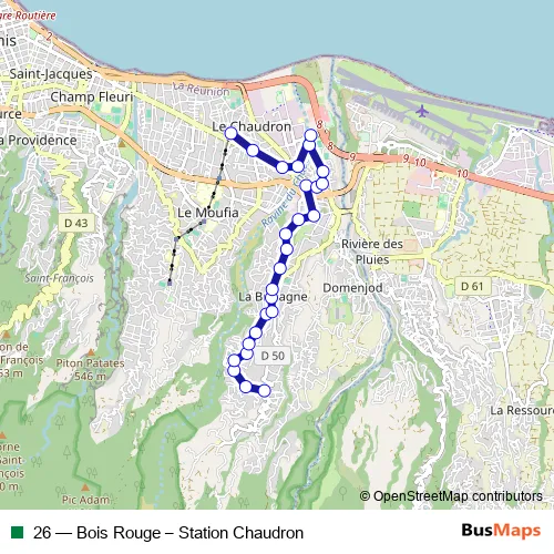 The first stop of the 26 bus route is Bois Rouge and the last stop is Station Chaudron. 26 (Bois Rouge – Station Chaudron) is operational during everyday.