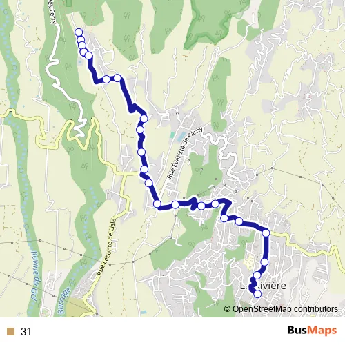 The first stop of the 31 bus route is Terminus Canots and the last stop is Mairie De La Rivière. 31 is operational during everyday.