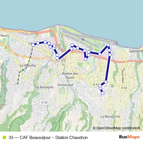 The first stop of the 33 bus route is CAF Beauséjour and the last stop is Station Chaudron. 33 (CAF Beauséjour – Station Chaudron) is operational during everyday.