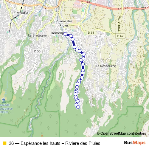 The first stop of the 36 bus route is Rivière des Pluies and the last stop is Espérance les Hauts. 36 (Espérance les hauts – Riviere des Pluies) is operational during everyday.