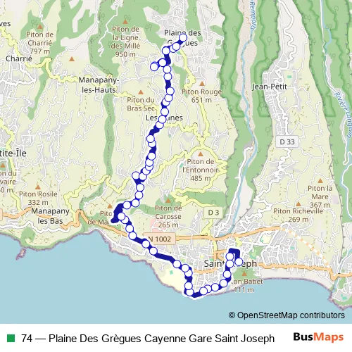 The first stop of the 74 bus route is Gare Routière De St-Joseph and the last stop is Eglise Plaine Des Grègues. 74 (Plaine Des Grègues Cayenne Gare Saint Joseph) is operational during everyday.
