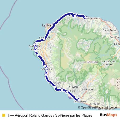 The first stop of the T bus route is Aéroport Roland Garros and the last stop is Gare de St-Pierre. T (Aéroport Roland Garros / St-Pierre par les Plages) is operational during everyday.