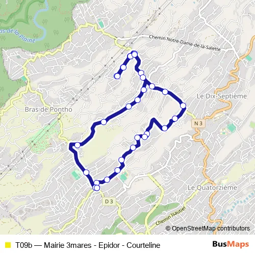 The first stop of the T09b bus route is Mairie Trois Mares and the last stop is Mairie Trois Mares. T09b (Mairie 3mares - Epidor - Courteline) is operational during everyday.