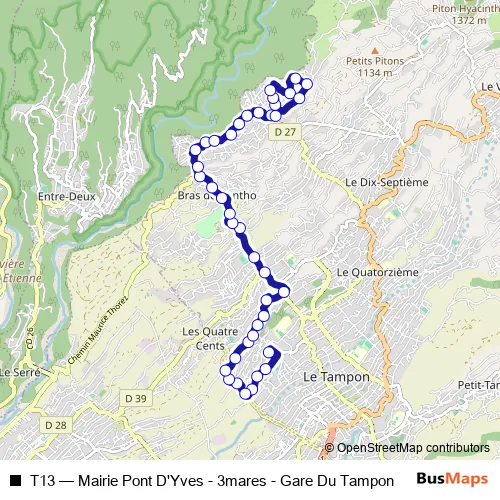 The first stop of the T13 bus route is Gare Routière Du Tampon Quai B and the last stop is Mairie Annexe Pont D'Yves. T13 (Mairie Pont D'Yves - 3mares - Gare Du Tampon) is operational during everyday.