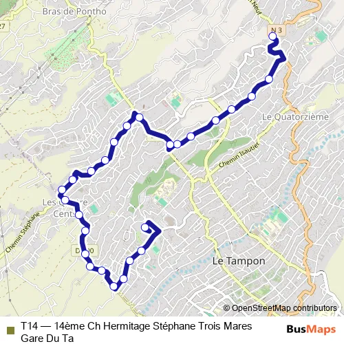 The first stop of the T14 bus route is Village 14e Km CD 27 and the last stop is Gare Routière Du Tampon Quai B. T14 (14ème Ch Hermitage Stéphane Trois Mares Gare Du Ta) is operational during everyday.