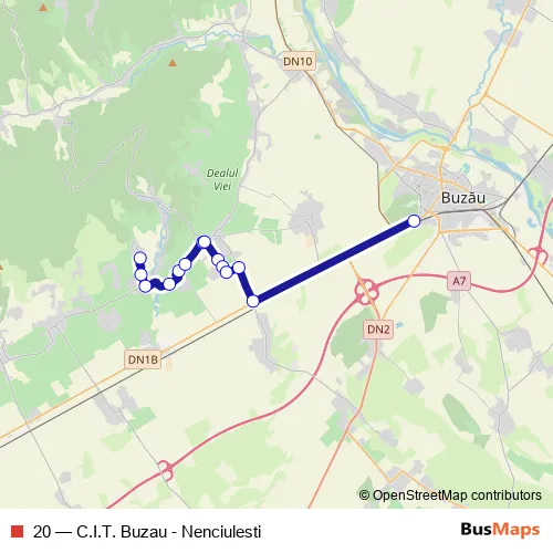 The first stop of the 20 bus route is Nenciulesti and the last stop is C.I.T. Buzau. 20 (C.I.T. Buzau - Nenciulesti) is operational during on weekdays.