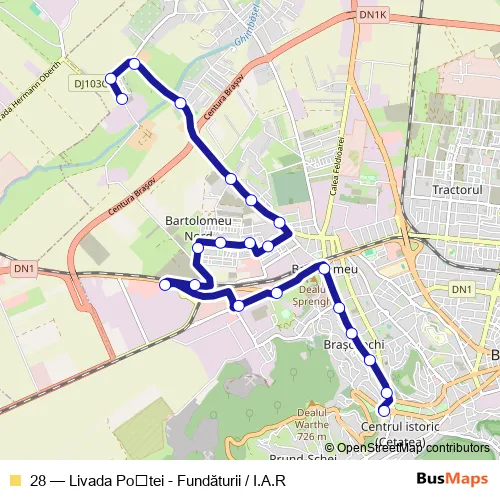 The first stop of the 28 bus route is Fundăturii cap linie and the last stop is Livada Poștei. 28 (Livada Poștei - Fundăturii / I.A.R) is operational during everyday.