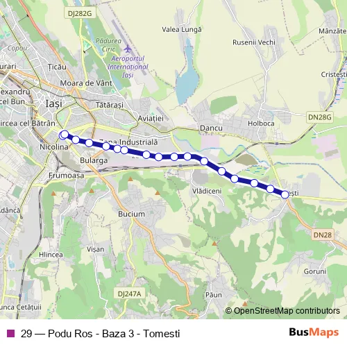 The first stop of the 29 bus route is Podu Roș (2) and the last stop is Tomești. 29 (Podu Ros - Baza 3 - Tomesti) is operational during everyday.