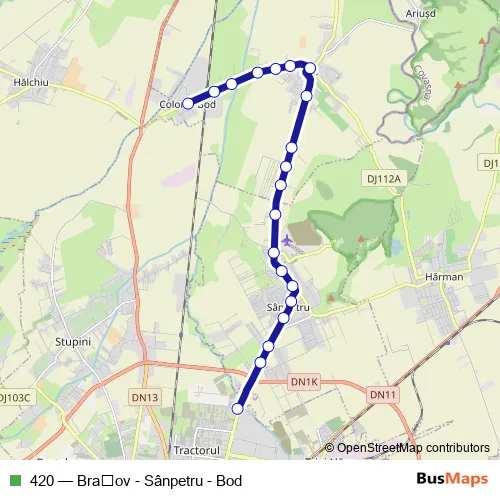 The first stop of the 420 bus route is Bod Colonie and the last stop is Rulmentul. 420 (Brașov - Sânpetru - Bod) is operational during everyday.